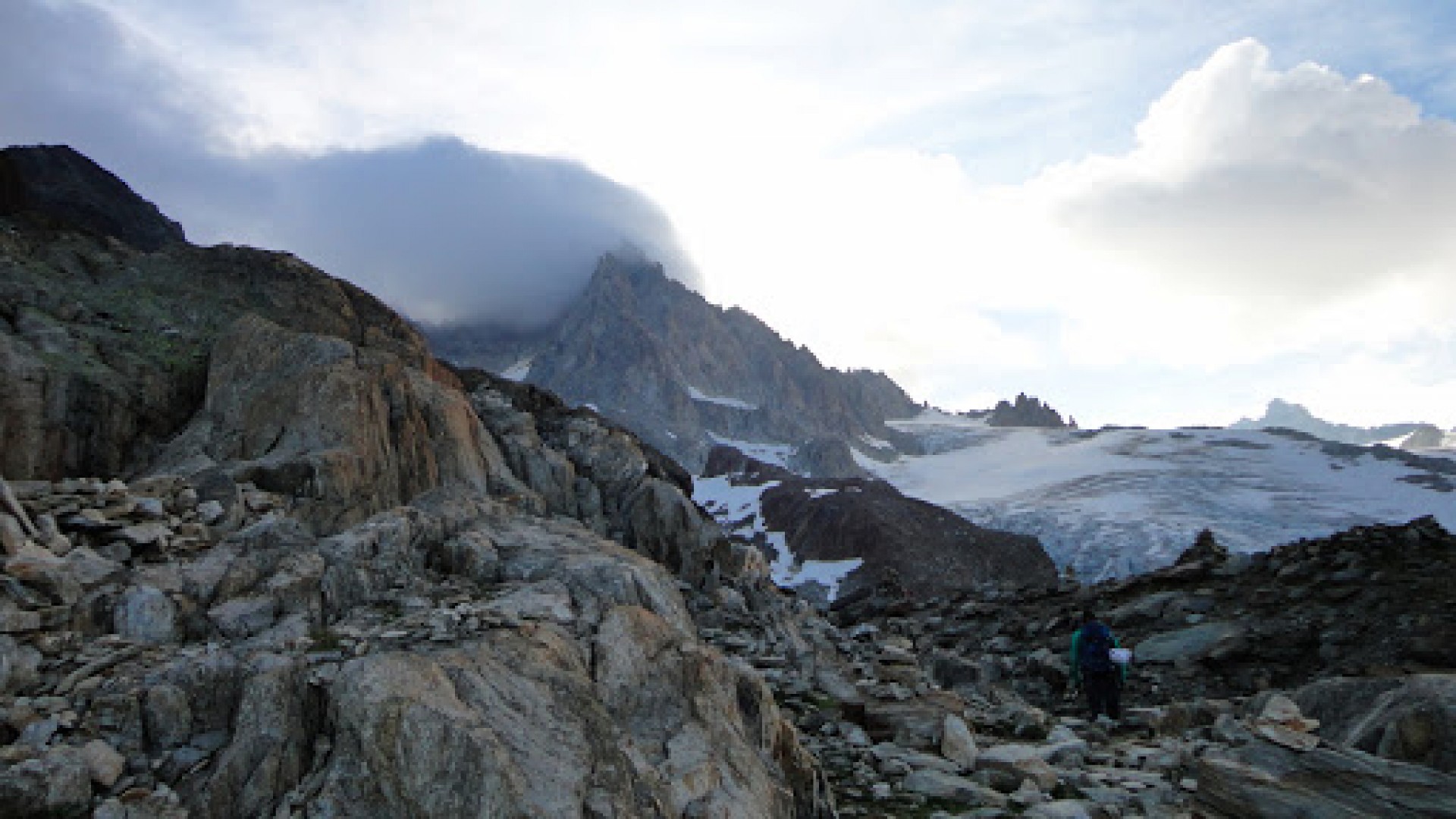 Ráno bolo po daždi vlhko, ale ako vymaľované. Slnko krásne osvetľovalo okolité štíty. Nemohli sme sa nabažiť takýchto výhľadov, dokonca sme videli aj Mont Blanc.