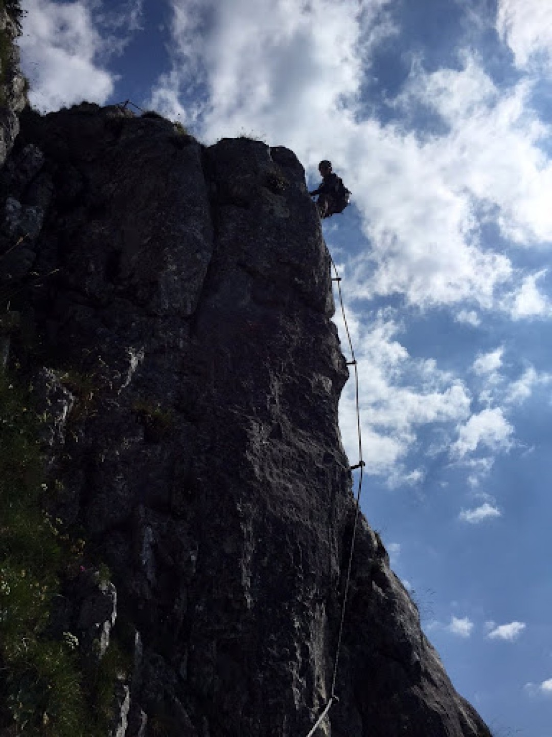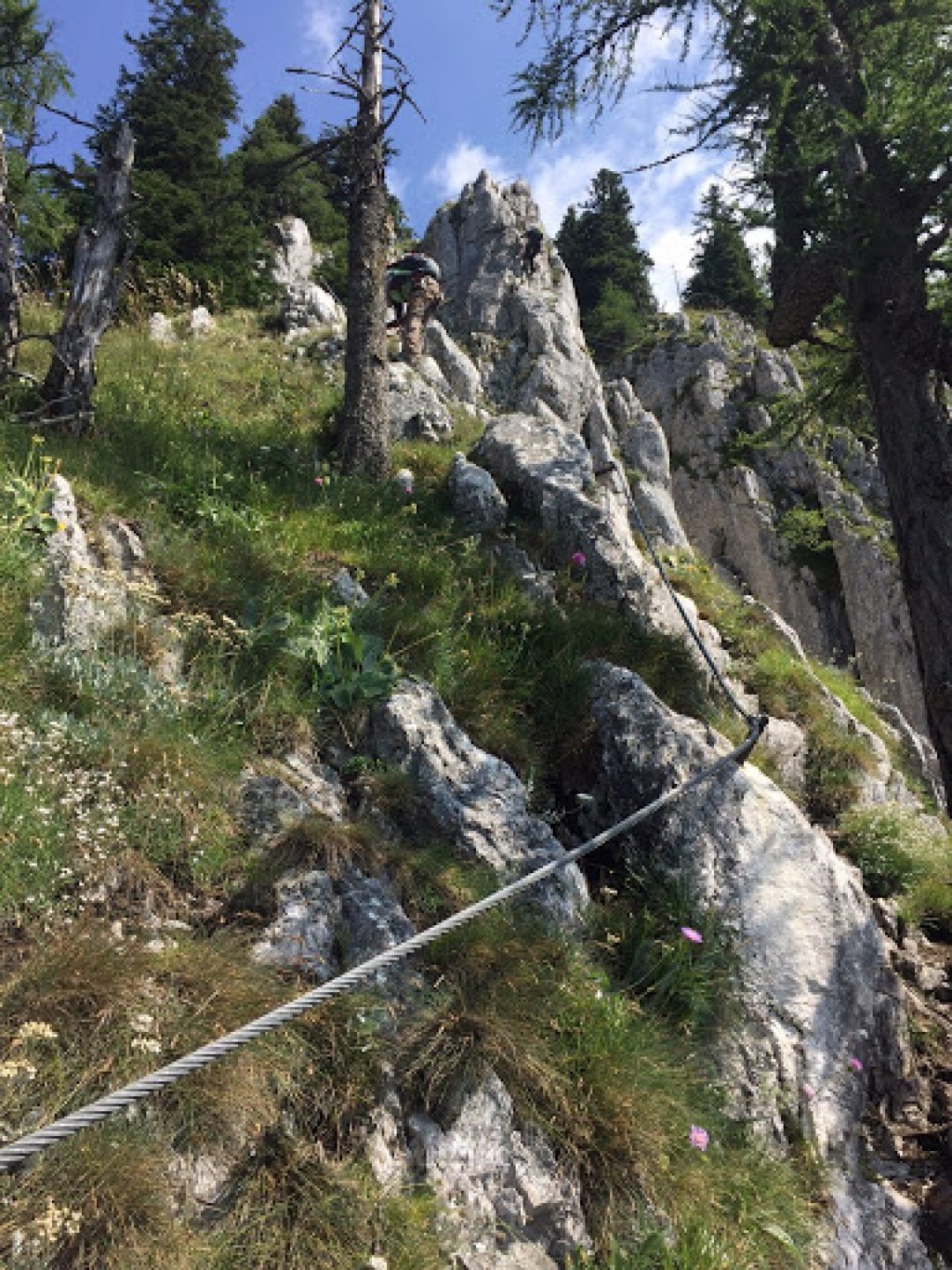Výhľady na dole ležiace jazero a okolité vrcholy je však úchvatný. Mali sme šťastie, že sme nemali pre sebou nejakú skupinu, ktorá by nás brzdila. Jednu skupinu rakúskych feratistov sme predbehli na jednom z viacerých miest, kde sa dá odpočinúť. Po zápise do knihy nás ešte čakal nepríjemný výšlap lúkou k poslednej časti feraty zakončenej exkluzívnym dvojitým nepálskym mostom. Tentokrát sme ho vynechali, pretože sme sa tešili na krátku, ale veľmi náročnú feratu Rosslochhöhlen v jaskyni. Nie je to klasická jaskyňa, ale skôr diera v skale. Najprv treba zísť dolu na k nepálskemu mostu, za ktorým je výšvih obtiažnosti E nasledovaný ďalšími D úsekmi až na koniec feraty.