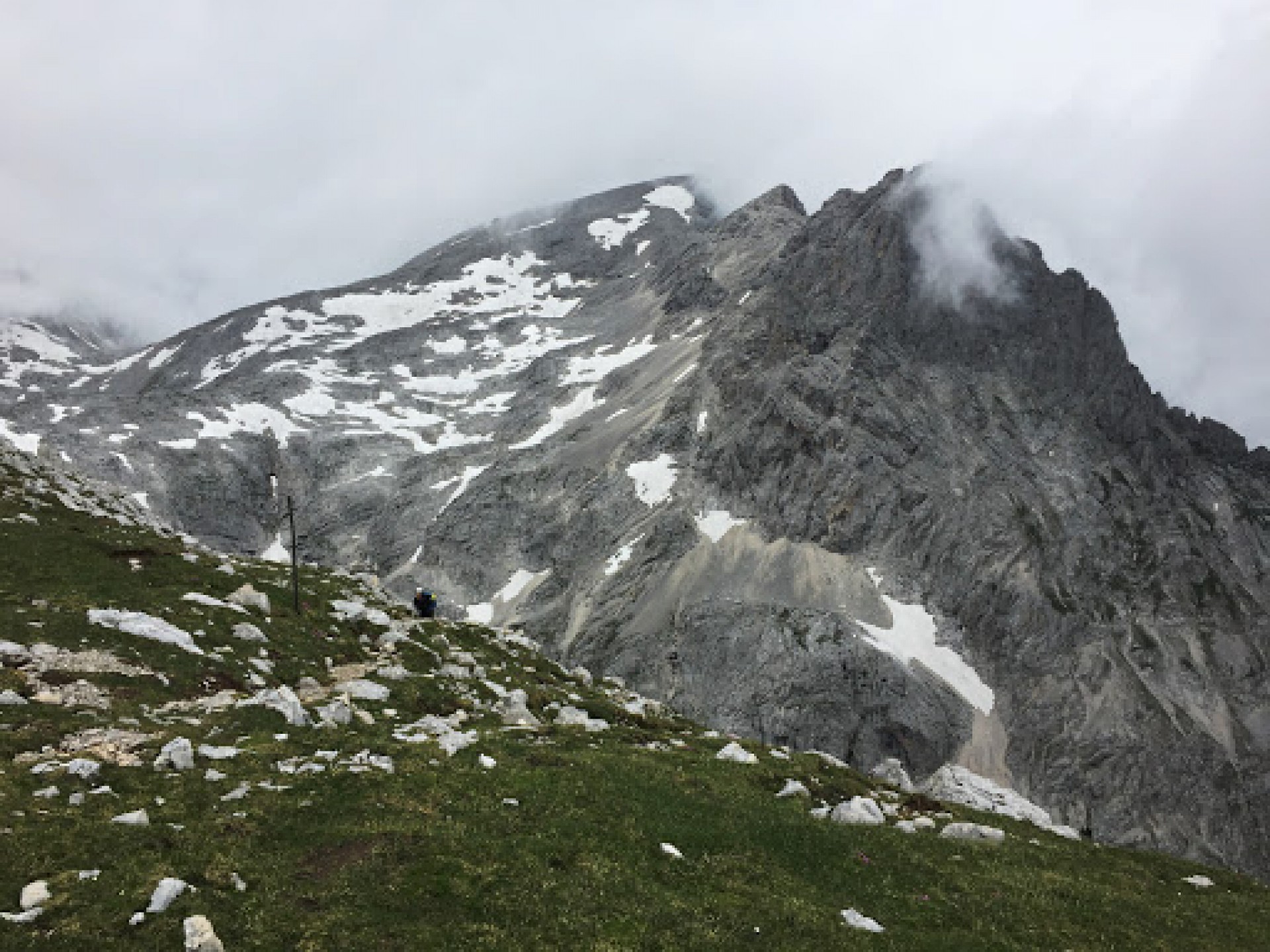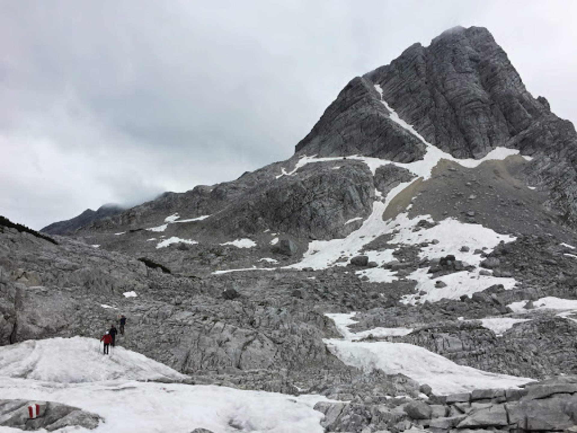 Na vrchole nie je obvyklý kríž, ale niečo ako slniečko alebo možno plesnivec. V každom prípade by mohol byť pekný výhľad z vrchola nebyť nízkej oblačnosti. Zostupová trasa je vedená juhozápadným smerom do ďalšieho sedla pod vrcholom Meisenberg, pričom sme museli prejsť dosť dlhé snehové pole. Neskôr sa chodník stáča na sever a napojí na pôvodný výstupový chodník. Už nasledoval len zostup na chatu.