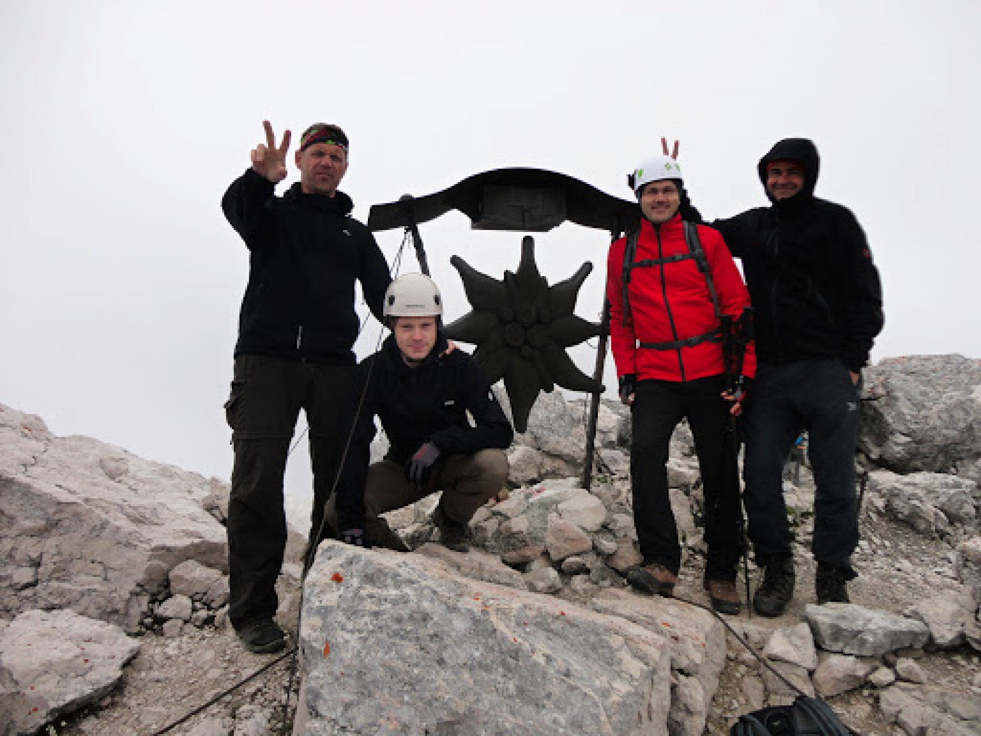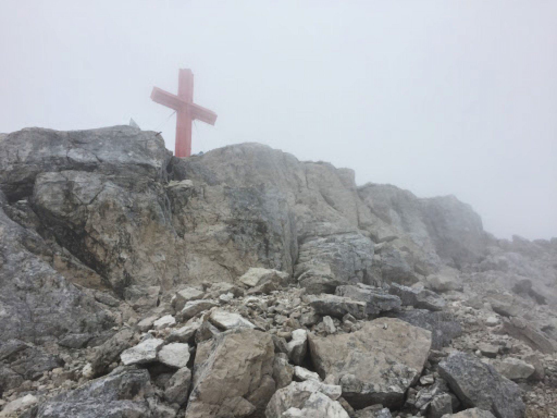 Po prejdení feraty sme stúpali záverečným hrebeňom až k samotnému vrcholu, na ktorom je osadený veľký červený kríž. Tento kríž je vidno od chaty.