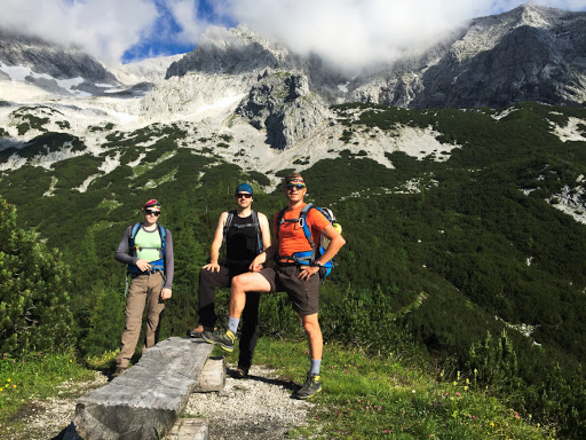 V nedeľu sme sa vydali na feratu Stodertaler, ktorou sme vystúpili na majestátny vrchol - Spitzmauer (2446 m n.m.). Od chaty bolo treba dosť dlho šliapať k nástupu samotnej feraty. Cestou sme sa kochali prírodnou scenériou tvorenou okolitými štítmi - Brotfall (2360 m), Spitzmauer (2446 m) a Temlberg (2331 m). Prešli sme zopár snehových polí a šotolinovým svahom sme prišli k nástupu feraty. Ferata je jednoduchá a má celkom staré istenie. Ferata končí v sedle, z ktorého treba vystúpať ešte 200 výškových metrov na samotný vrchol Spitzmauer.