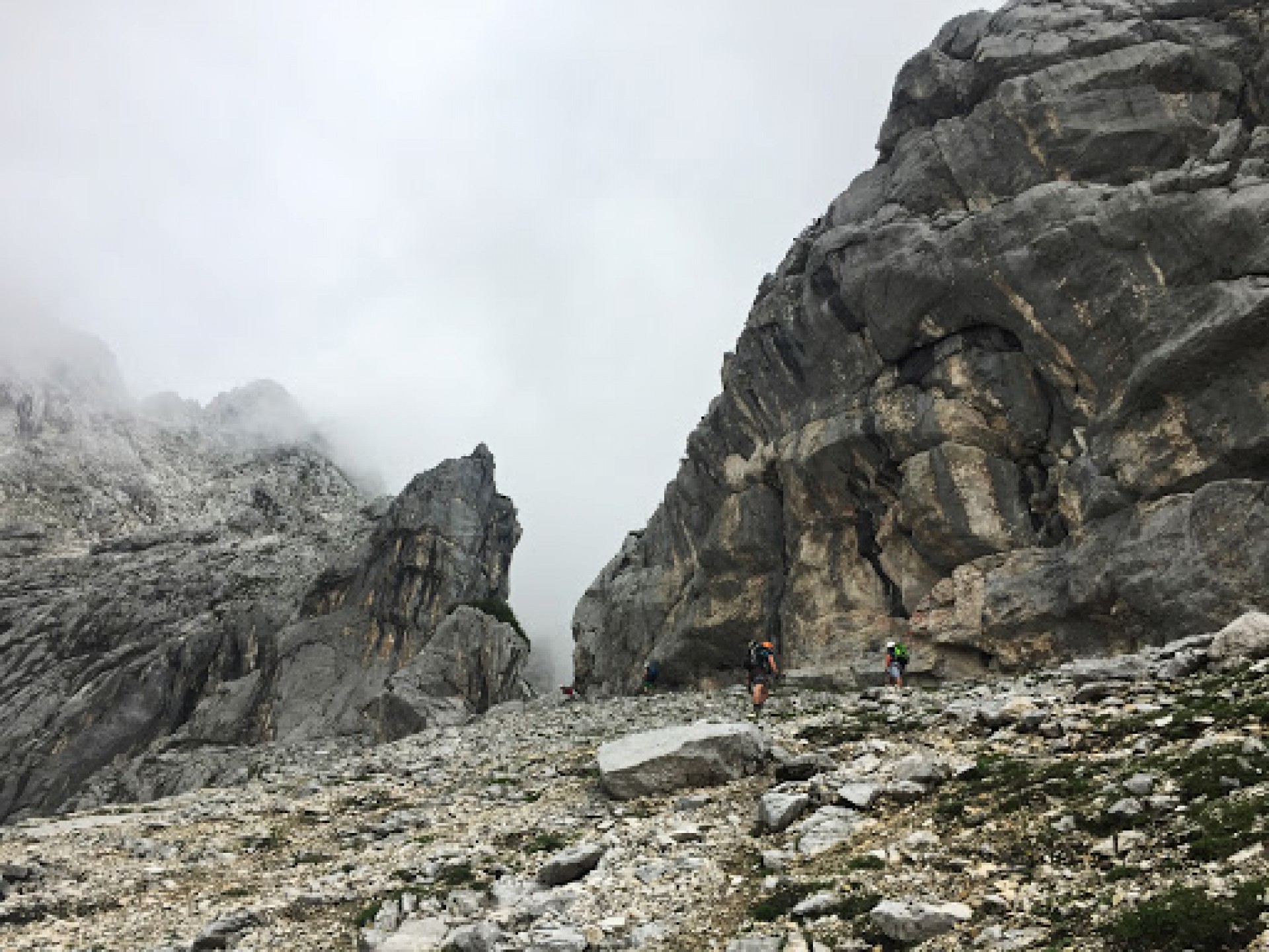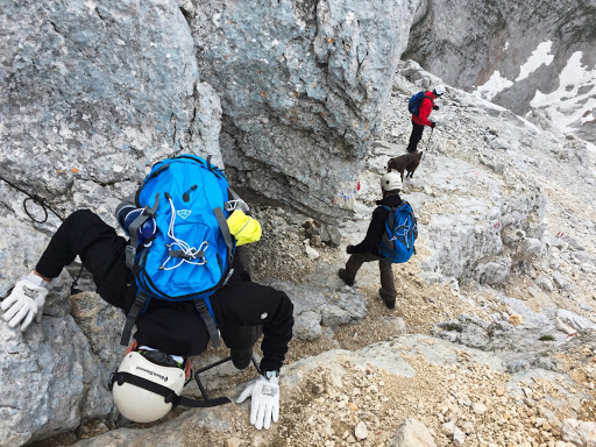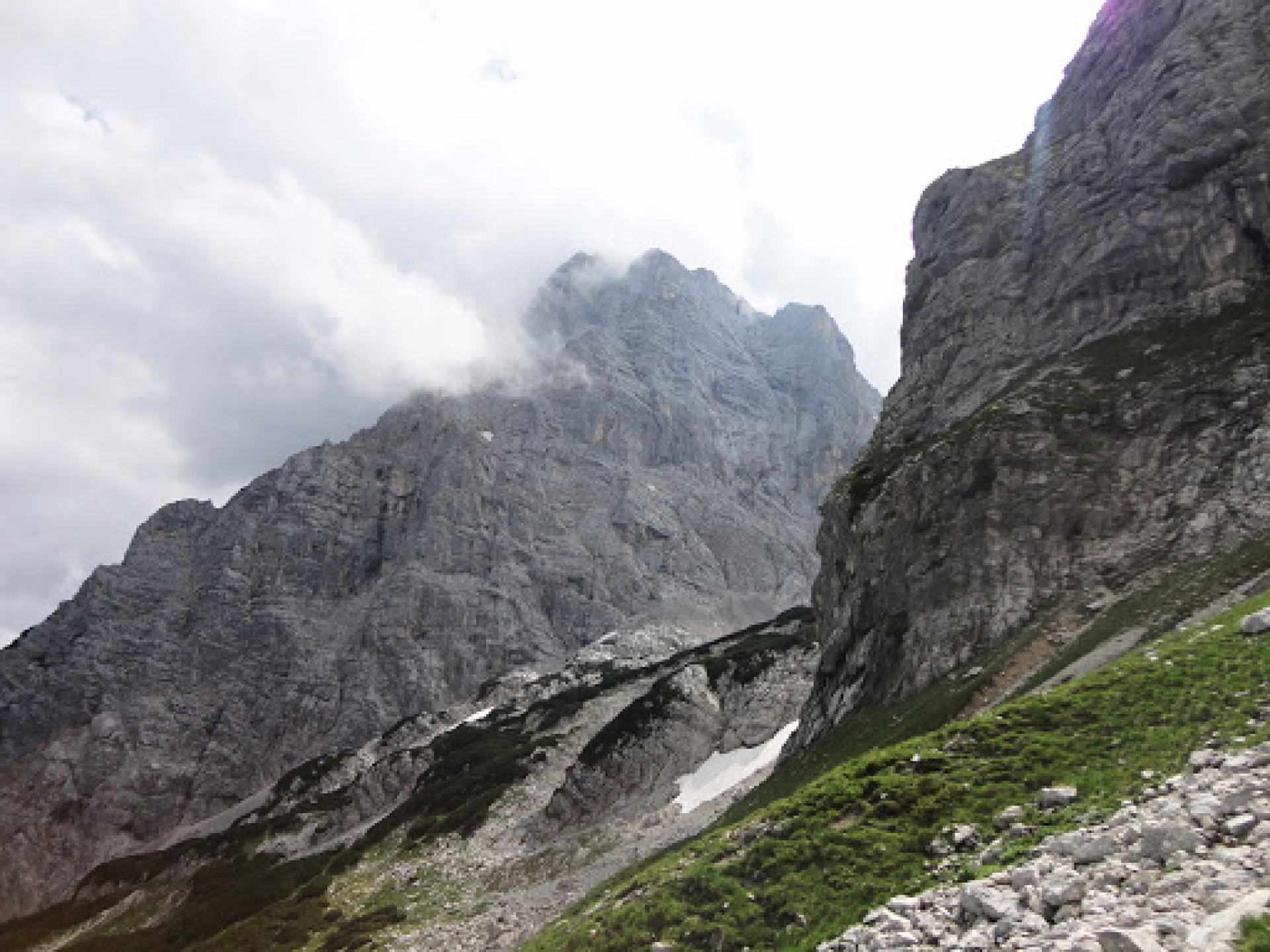 Na chate sme sa spoznali so štvoricou Slovákov, s ktorými sme sa vybrali v pondelok na feratu Bert-Rinesch, ktorá bola hlavným cieľom expedície. Od známeho rázcestníka nad chatou sme sa vydali smerom do kotla Kühkar. Na začiatku kamenného mora sme znovu odbočili doprava a stúpali sme k začiatku hrebeňa ferata Bert-Rinesch má 2 časti - krátku do sedla Lokomotive a druhú, ktorej podstatnú časť tvorí skupina rebríkov. Zo sedla Lokomotive sme museli zostúpiť prvým rebríkom k dosť šmykľavému traverzu, za ktorým nás už čakali povestné rebríky. Niektoré z nich boli mierne previsnuté a preto aj výživné.