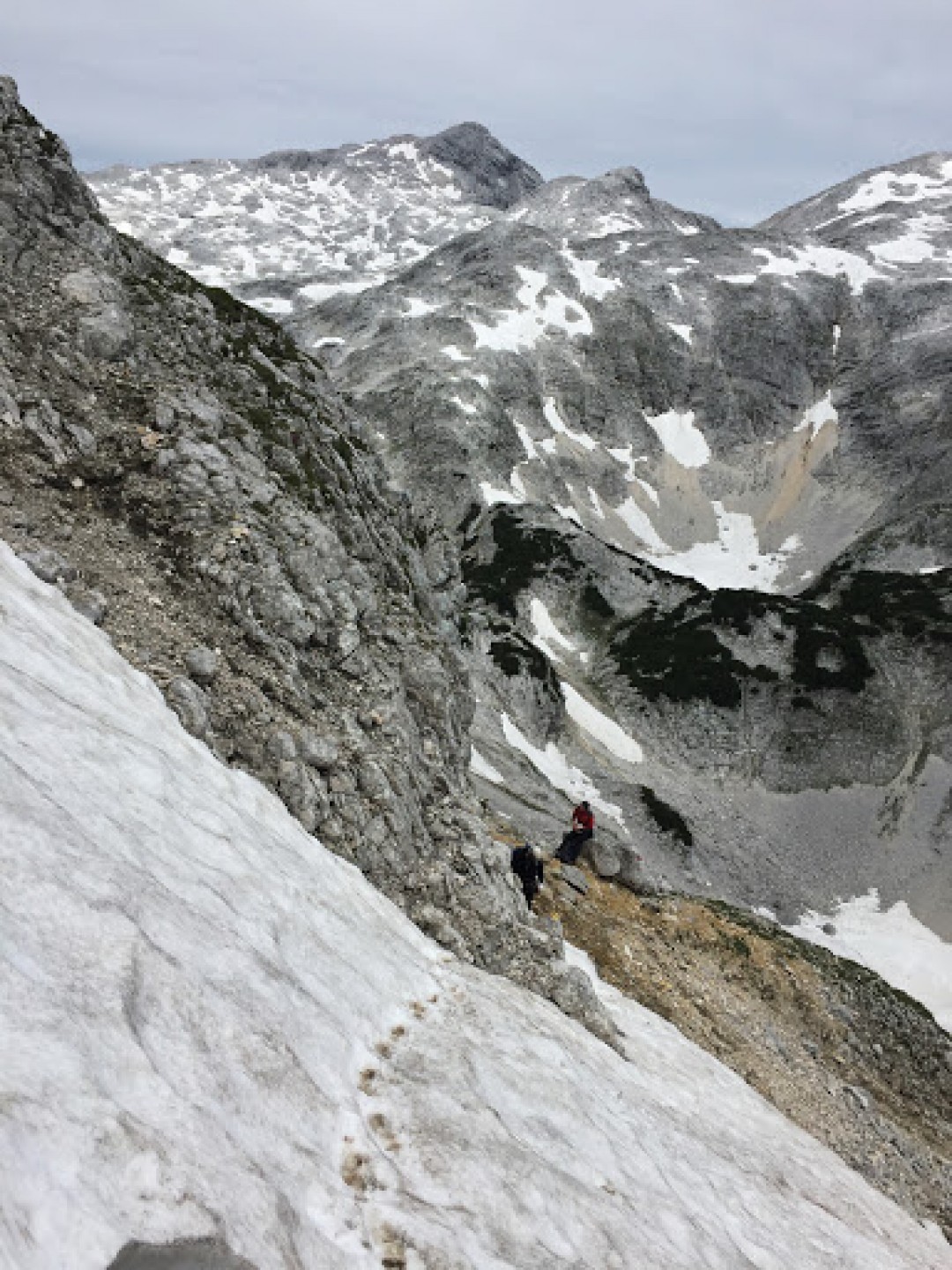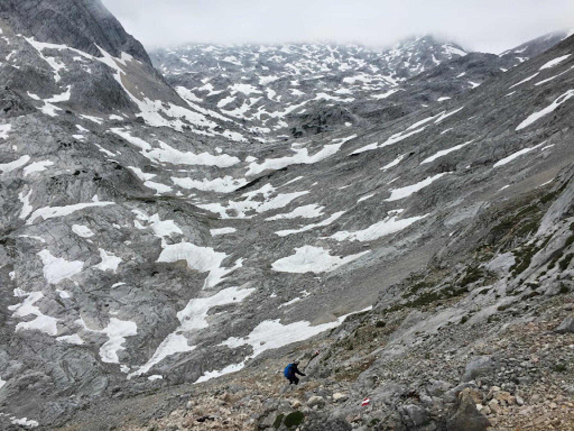 Po tradičnom fotografovaní sme začali zostupovať "normálkou" do sedla Brotfallscharte. Prešli sme okolo malej jaskynky, za ktorou náš čakalo dlhé a dosť strmé snehové pole. Nasledoval len dlhý a unavný zostup na chatu.