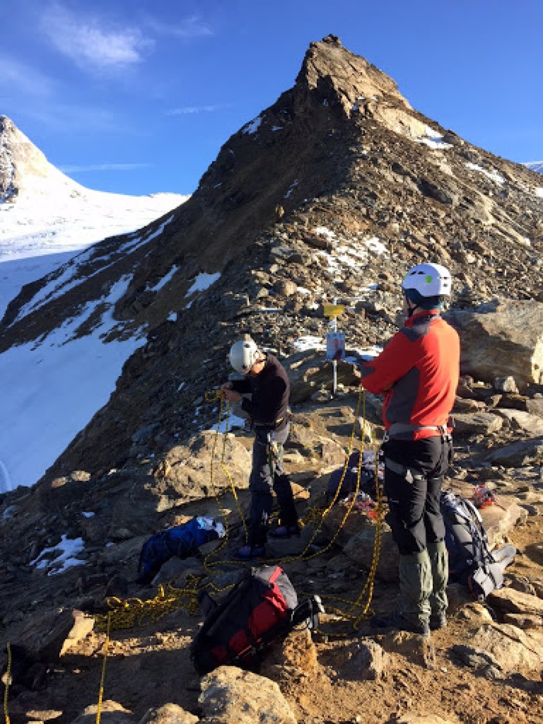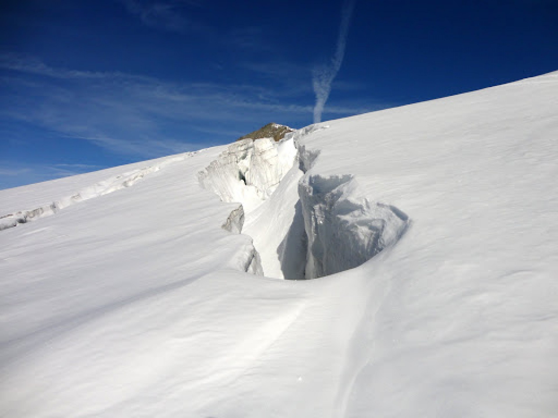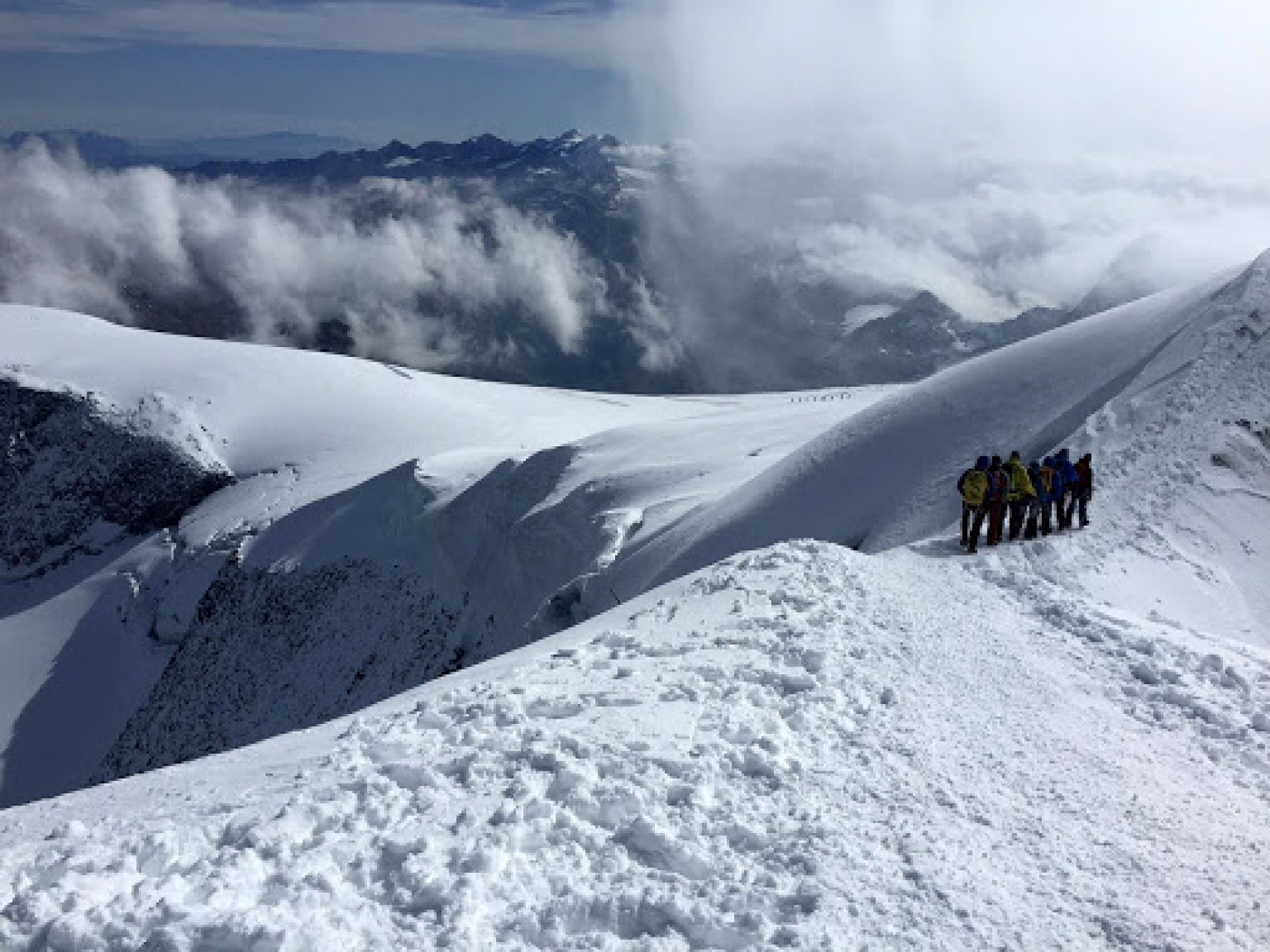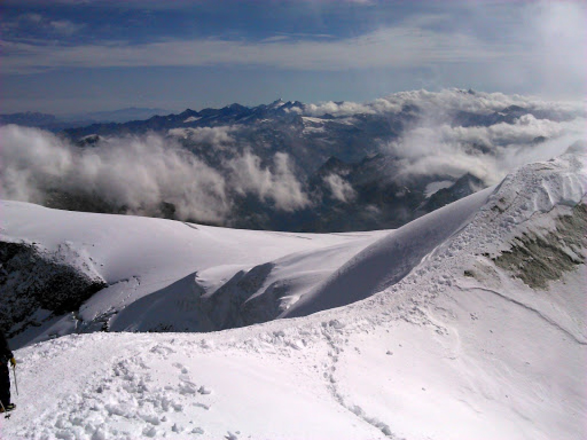 Ráno sme sa zobudili medzi poslednými a kopec ľudí už bol na ceste k vrcholu. Urobili sme si raňajky a vyrazili sme tiež. Počasie bolo perfektné, modrá obloha a ďaleké výhľady. Po krátkom výstupe na mieste, kde sa lanové družstvá naväzujú na lano, sme takisto urobili lanové družstvo a začali sme stúpať hore po ľadovci. Po tohtoročnom teplom lete bol ľadovec riadne potrhaný a trhlín bolo viac ako dosť. Našťastie boli celkom čitateľné a pár kritických úsekov sme vždy bezpečne prekročili.